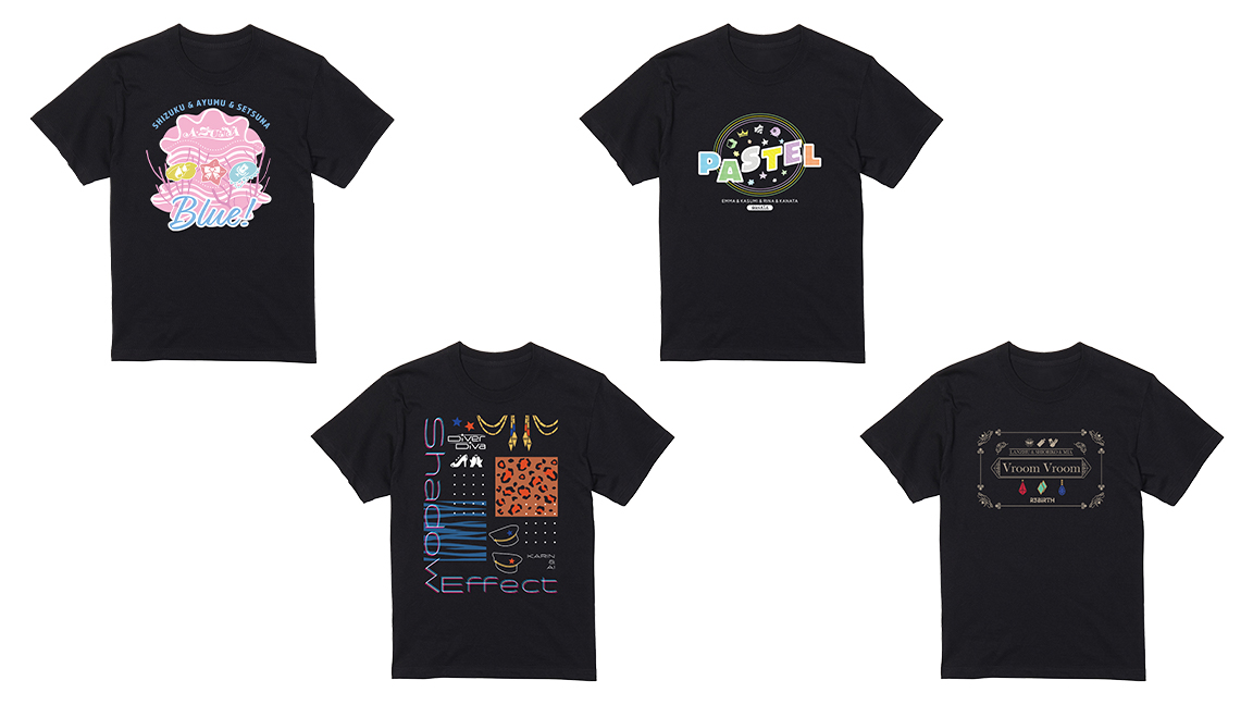 虹ヶ咲学園スクールアイドル同好会各ユニットの楽曲、「Blue!」「PASTEL」「Shadow Effect」「Vroom Vroom」をイメージしたデザインのTシャツに仕上げました。